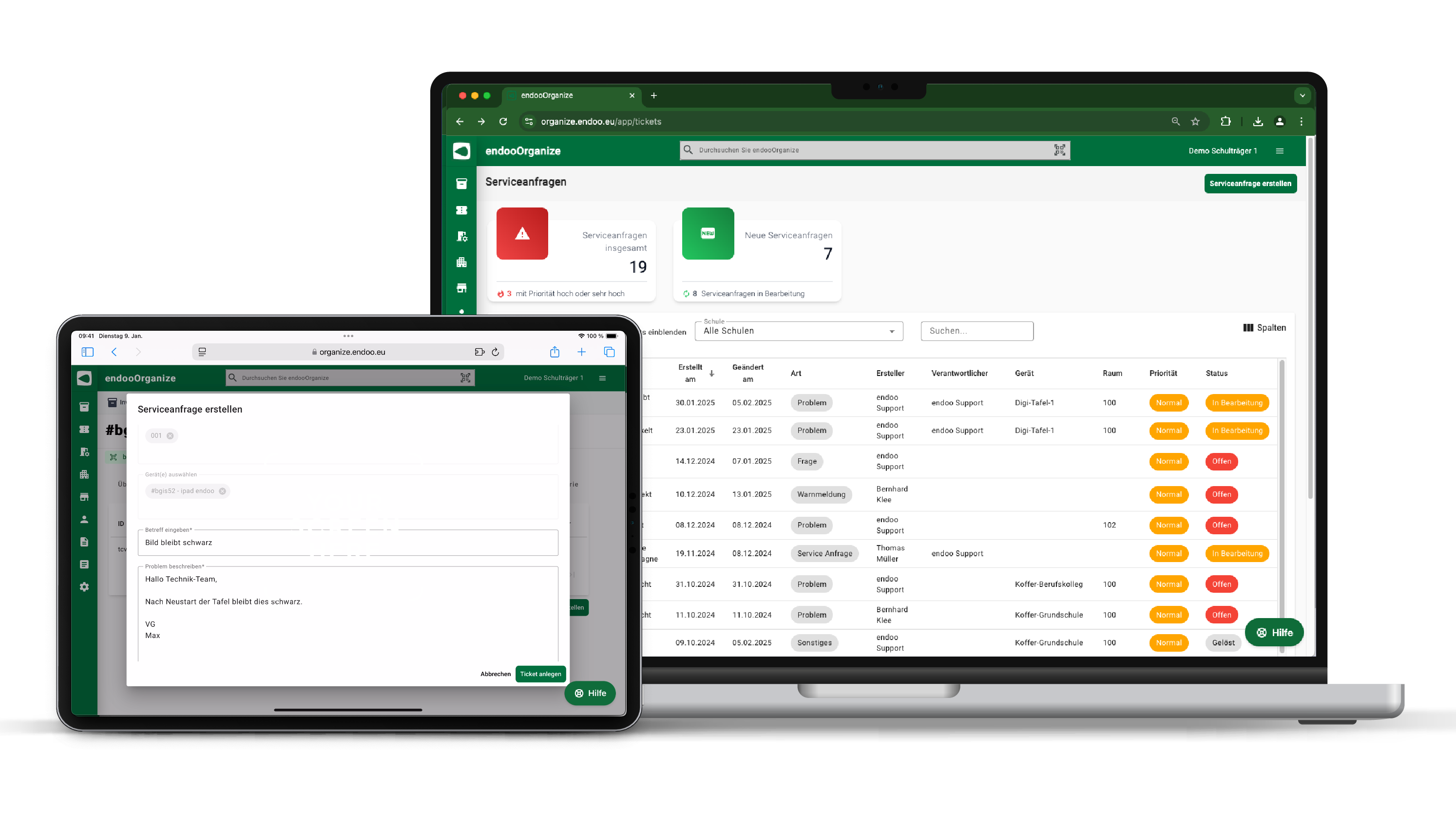 Optimieren Sie Ihre Supportprozesse durch nahtlose Zusammenarbeit zwischen Schulen und Schulträger – schnelle und effektive Problemlösungen für Geräte, Software und allgemeine Anfragen. Inklusive Analyse- und Verknüpfungsmöglichkeiten, um auch der Fehleranfälligkeit des Inventars den Kampf anzusagen!
